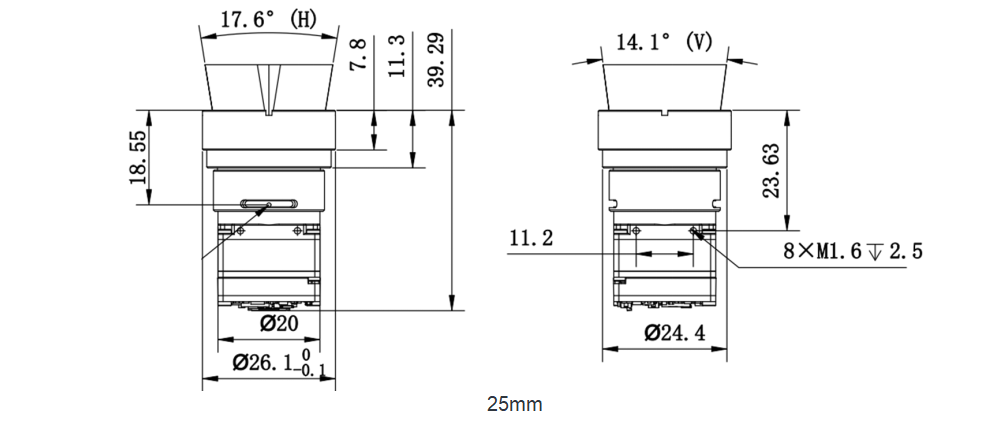 दृश्याचे क्षेत्र (एच × व्ही) |