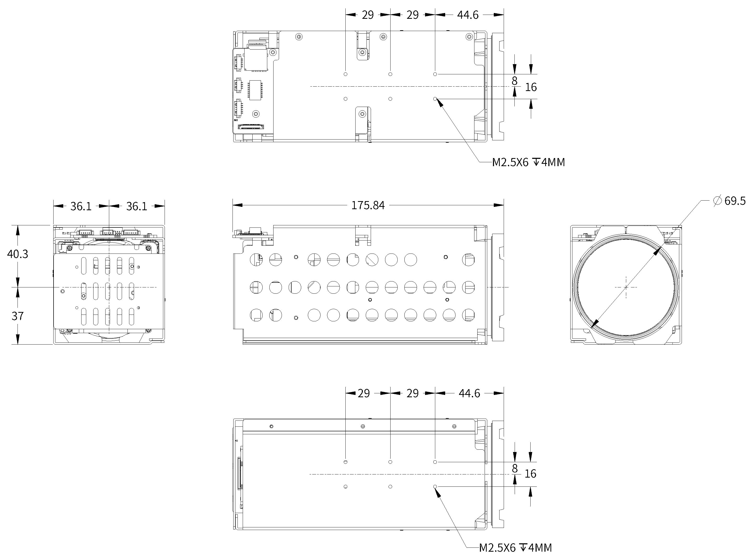 4 पीआयएन इथरनेट पोर्ट, 6 पिन पॉवर आणि यूएआरटी पोर्ट, 5 पिन ऑडिओ पोर्ट. 30 पिन मिपी |